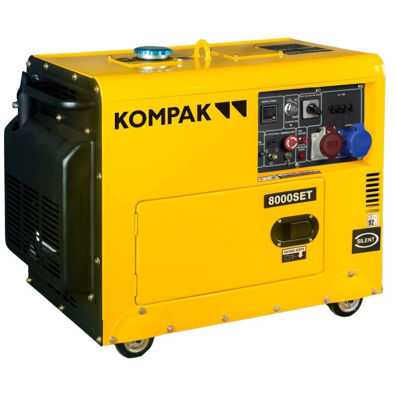 Generador Kompak diésel inosonorizado kp8000se-t trifásico con un motor de 4 tiempos. Cuenta con una potencia nominal de 7,5 kva (400) y 5,5 kw (230) y una potencia máxima de 7,9 kva (400) y 6 kw (230), goza con una tecnología innovador FULL POWER, refrigerado por aire e inyección directa.