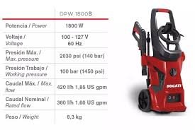 La DPW1800S es la variante para 110–127 V / 60 Hz con cifras de presión/caudal algo distintas (hasta 140 bar y 360–420 L/h según ficha). Para Europa 220 V/50 Hz, tu DPW1800 trabaja 150 bar / 330 L/h.