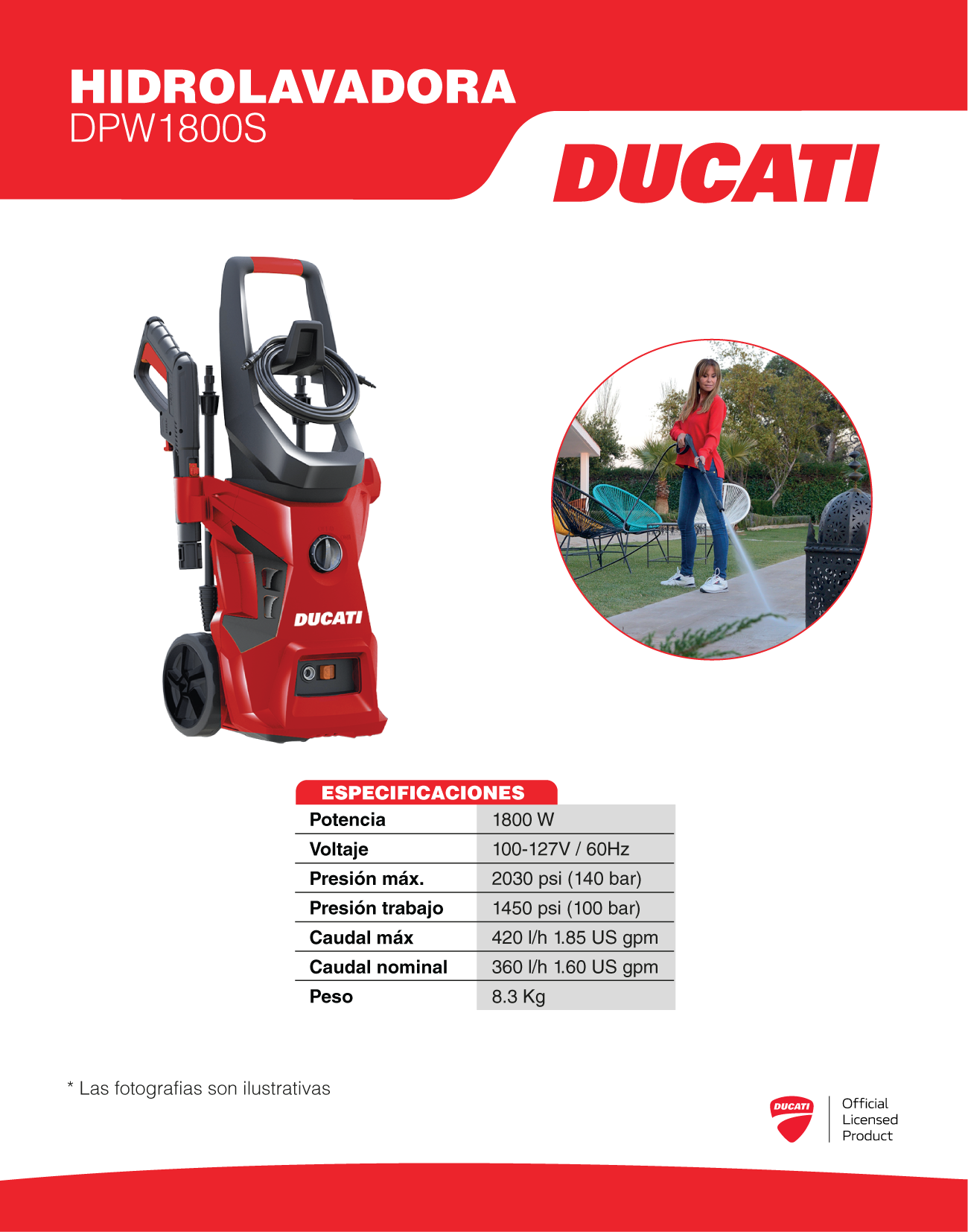 ¿Qué incluye la Hidrolimpiadora Ducati DPW1800? (presión, caudal y accesorios)