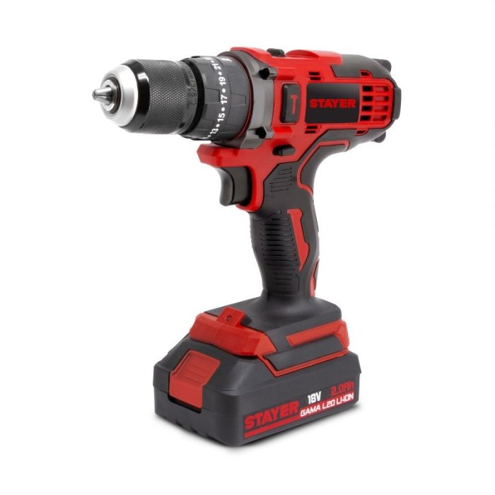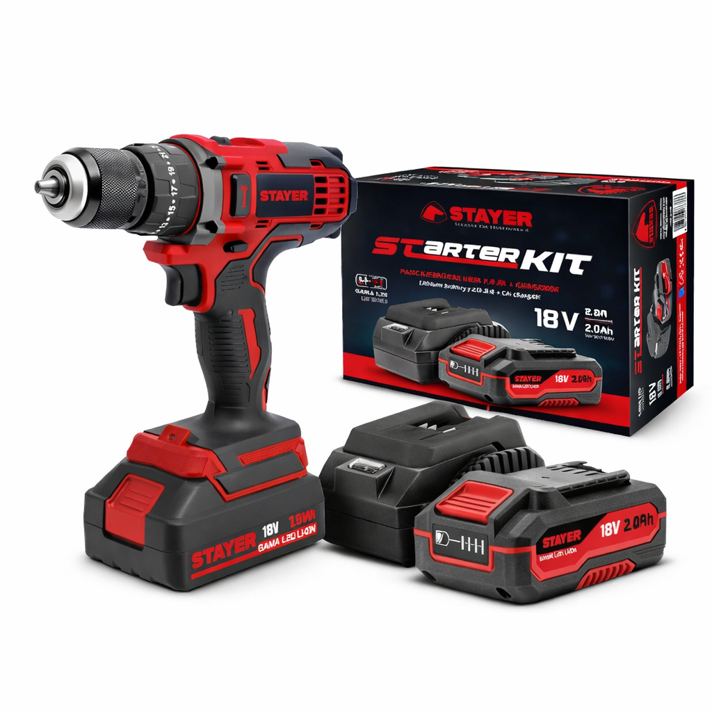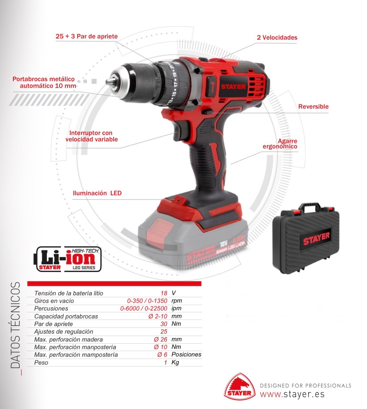 Taladro atornillador / percutor Stayer 18V 30Nm. Portabrocas automático de 10mm con bloqueo de seguridad.